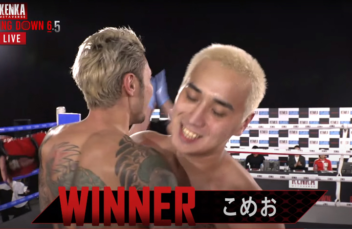 高垣が徐々に詰め、こめおがカウンターを狙う展開。こめおのパンチのほうが的確に捉えていたように見えたが、 下がりながらカウンター狙いの姿勢が審査員にはマイナスポイントだった模様、ドロー3で延長戦へ。延長戦はそれなりに 打ち合うもののお互いにクリーンヒットが無い。ドロー3で再延長戦へ。