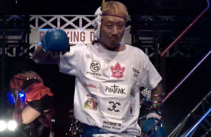 しっかり練習したのだろうか序盤から左右のパンチを繰り出す10人ニキ、パンチをうたれても、今まで程はそっぽを向かない、おでんツンツン男も必死にパンチを返し応戦。 ディフェンスなしのブレイキングダウンらしい展開が終始続き時間切れ。両者決め手を欠き判定1-1で延長戦へ。