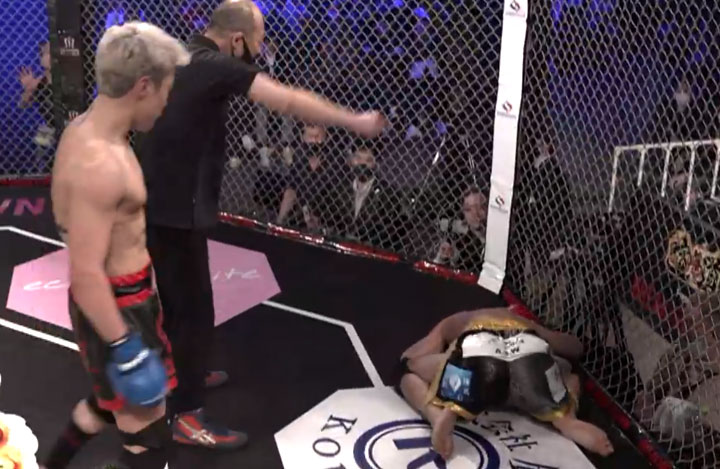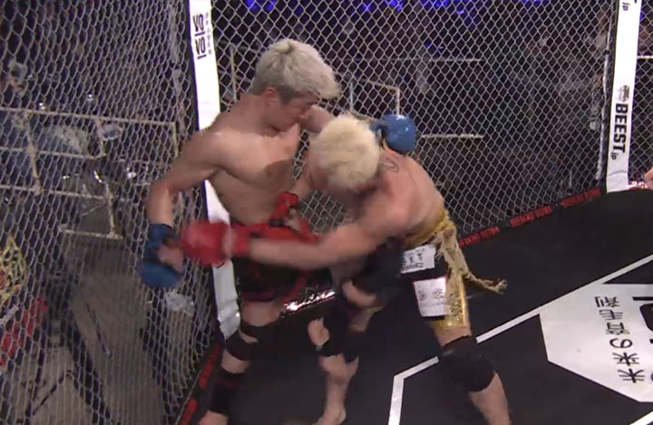 こめおをフェンスまで押し込み、フェンスを背にしたこめおは 体を入れ替えようと回り込んだ瞬間、YUSHIがみぞおちへ膝蹴り一閃。 こめおはダウン 悶絶し うずくまる。レフリーのカウントが始まり10カウントが数えられた、こめおは立ちあがれず試合が終了。